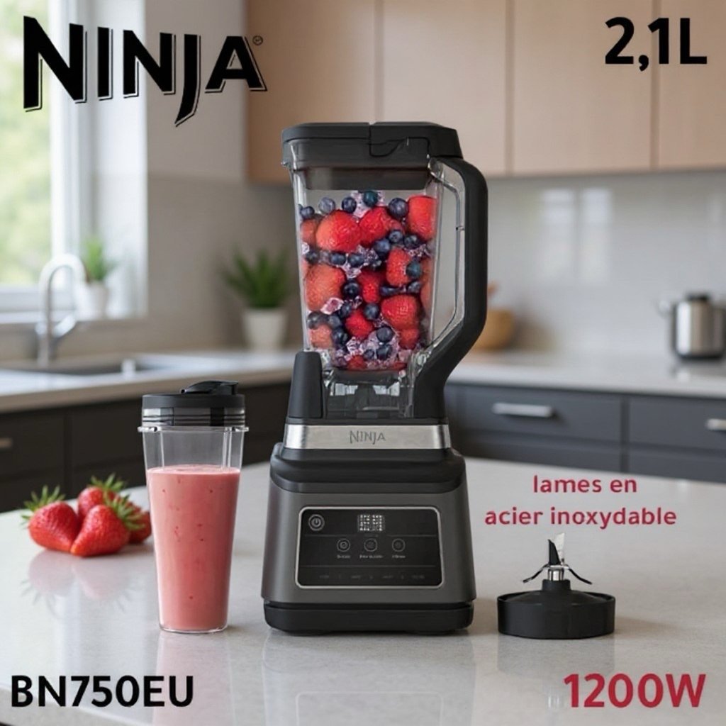 Blender 1200W 2,1L, gobelet individuel 700 ml ,21 000 tr/min 2 programmes automatiques et 3 programmes spécifiques NINJA BN750EU