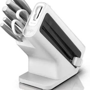 Ensemble de 6 couteaux Ninja StaySharp en acier inoxydable avec affûteur intégré, comprenant des ciseaux de cuisine, un couteau de chef, un couteau à découper, un couteau à pain, un couteau polyvalent et un couteau d’office, blanc, K62006EUWH